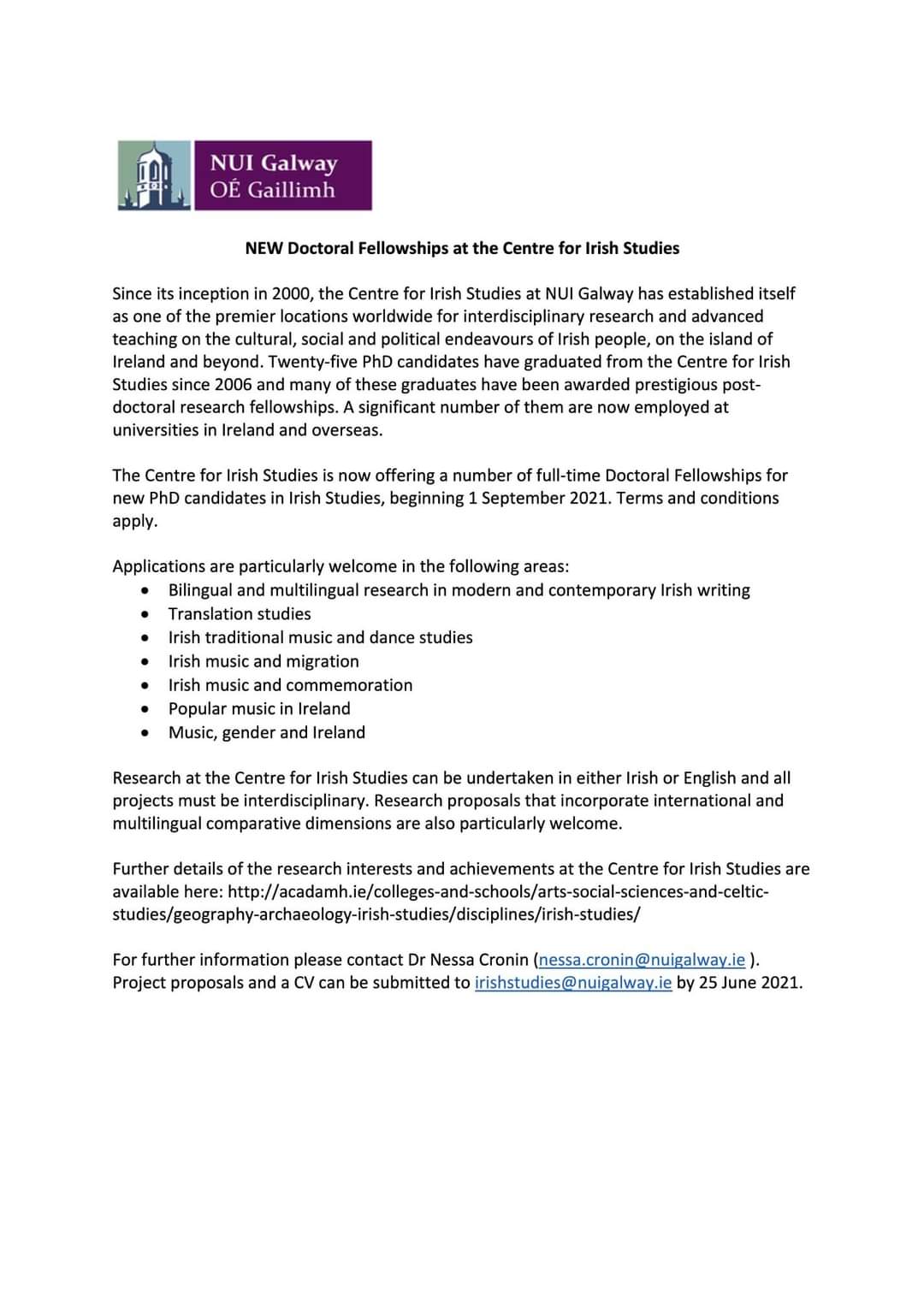 Irish Studies Nuig On Twitter New Doctoral Fellowships In Irish Studies At Nui Galway The Centre For Irish Studies Is Delighted To Announce A Number Of Doctoral Fellowships For New Applicants To